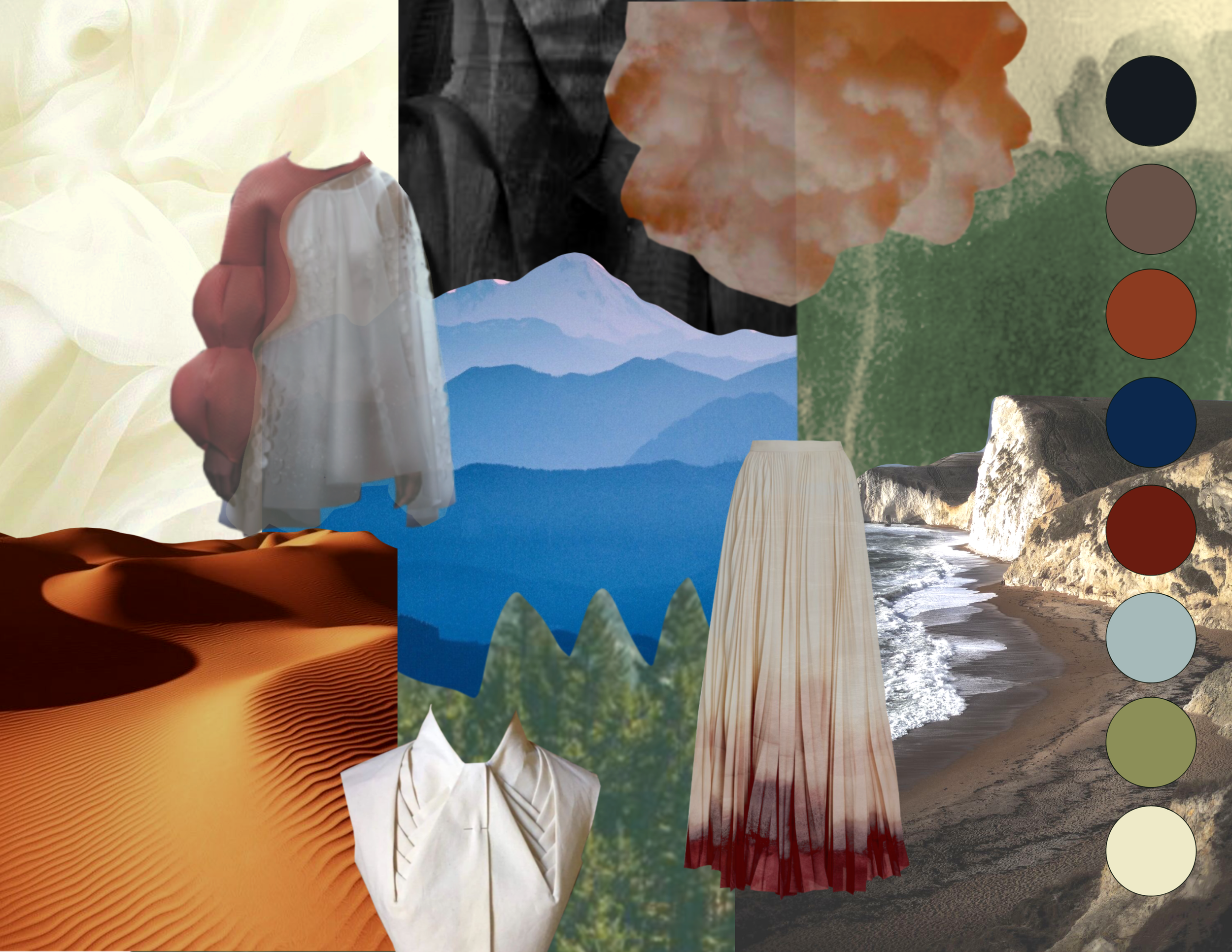 Horizons symbolize limitless potential. “Beyond the horizontal line there are adventures yet to be taken and dreams yet to be realized” (M, 2019). Different landscapes such as mountains, deserts, valleys and coast create different silhouettes along the horizon. I want this collection to resemble the beauty of different landscapes and the silhouettes they create.